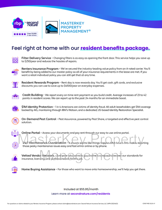 At MasterKey Property Management, we strive to provide an experience that is cost-effective and convenient. That’s why we provide a Resident Benefits Package (RBP) to address common headaches for our residents. Our program handles insurance, pest control, air filter changes, credit building, and more at a rate of $55.95/month added to each property as a required program. More details provided upon application.