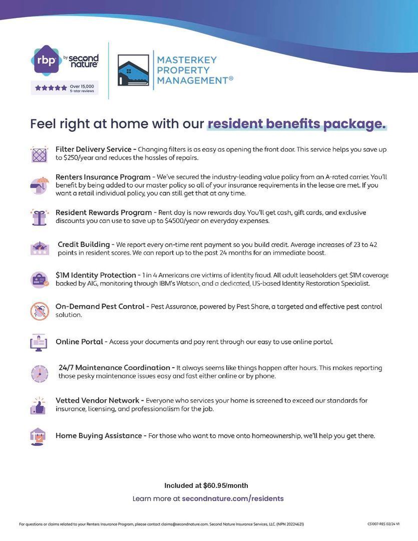 At MasterKey Property Management, we strive to provide an experience that is cost-effective and convenient. That’s why we provide a Resident Benefits Package (RBP) to address common headaches for our residents. Our program handles insurance, pest control, air filter changes, credit building, and more at a rate of $60.95/month added to each property as a required program. More details provided upon application.